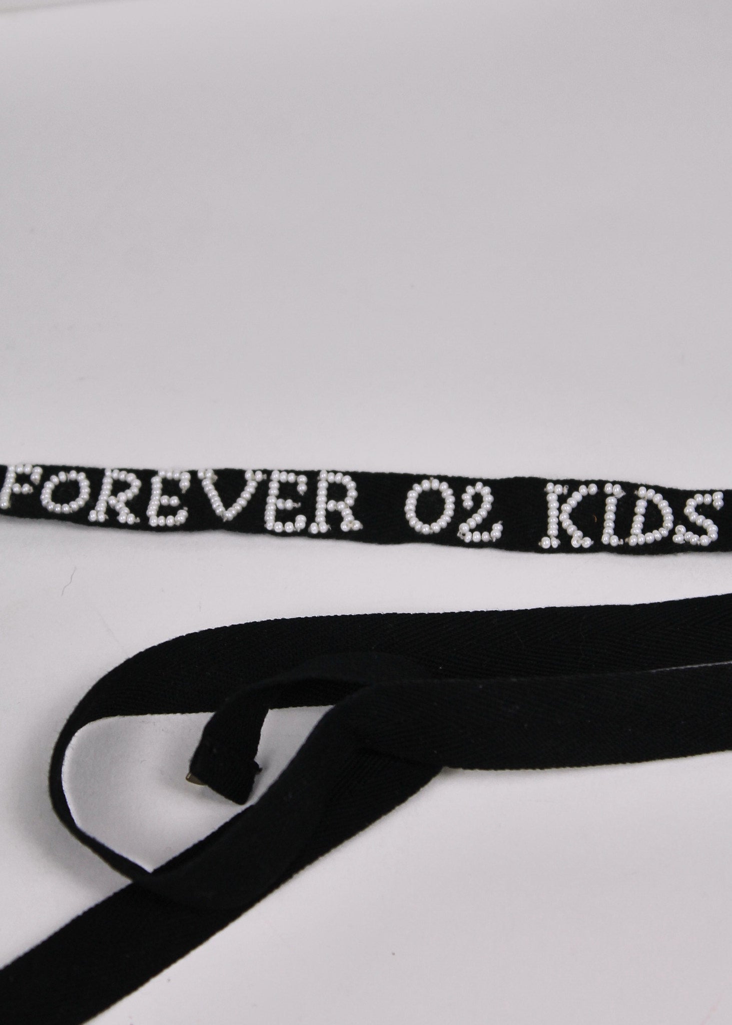 - White glass beading embroidery spelling 'FOREVER 02 KIDS'